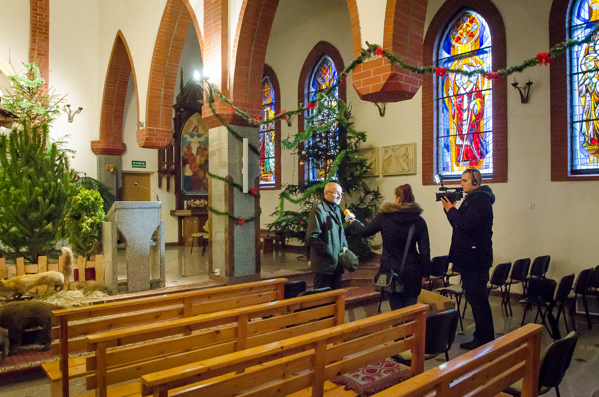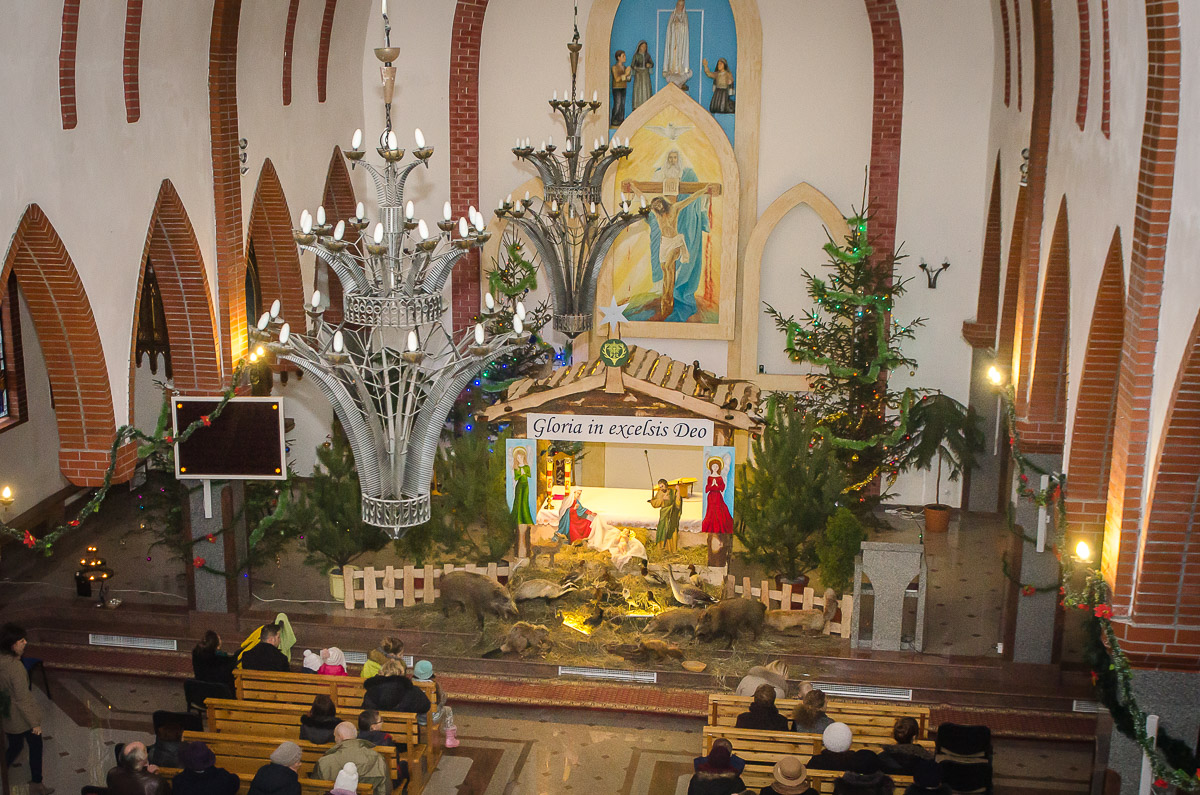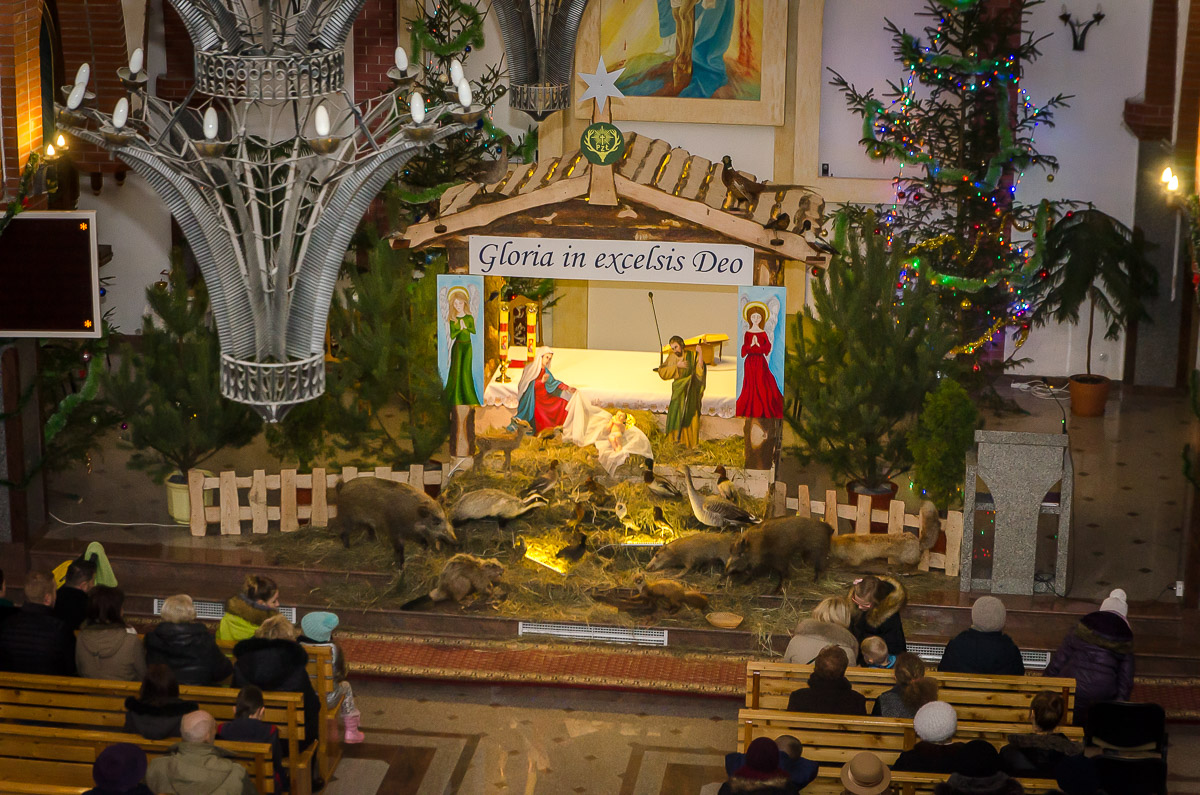 Na osobną uwagę zasługuje zaprezentowana po raz pierwszy w Łomży myśliwska szopka bożonarodzeniowa. Ideę wystawienia takiej szopki zgłosił kol. Mariusz Dejneka podczas obrad Komisji Kultury i Promocji Łowiectwa i szybko uzyskała ona akceptację wszystkich członków komisji. Celem jej było pokazanie prawdziwego oblicza myśliwych kultywujących dawne tradycje łowieckie i dobrych gospodarzy w swoich łowiskach. Wielką pomocą już na samym początku wykazał się ksiądz kapelan Mirosław Orłowski szybko znajdując łomżyński kościół pod wezwaniem Św. Andrzeja Boboli i księdza Andrzeja Popielskiego gotowego podjąć się tego wyzwania. Dużym problemem okazał się brak czasu na spreparowanie odpowiednich trofeów, ale kol. Jerzy Włostowski dzięki swoim szerokim znajomościom i dobrym relacjom szybko zorganizował potrzebne eksponaty. W tym miejscu należą się podziękowania dla kolegów: Mariana Podleckiego, Zdzisława Truszkowskiego, Henryka Ptasznika i Jerzego Włostowskiego. Transportem trofeów zajęli się: Ula Sokólska i Mariusz Dejneka. Podziękowania za pomoc w aranżacji szopki należą się koledze Stanisławowi Purcelowi. Pomocą w transporcie drzewek do kościoła służył kolega Waldemar Górski. W wielokrotnych spotkaniach organizacyjnych z księdzem Andrzejem Popielskim brali udział koledzy Jerzy Włostowski i Mariusz Dejneka. Wydarzenie zostało medialnie nagłośnione dzięki staraniom księdza Andrzej Popielskiego na portalach: mylomza.pl, 4lomza.pl, bialystok.tvp.pl, wyborcza.pl i tvitv.pl. Wywiadów dla lokalnego radia i telewizji udzielał kolega Jerzy Włostowski. Efekt końcowy w postaci myśliwskiej szopki bożonarodzeniowej prezentującej rodzime gatunki zwierząt można podziwiać na zdjęciach w poniższej galerii.