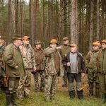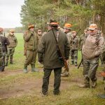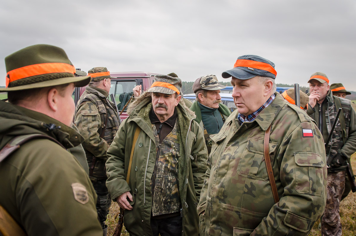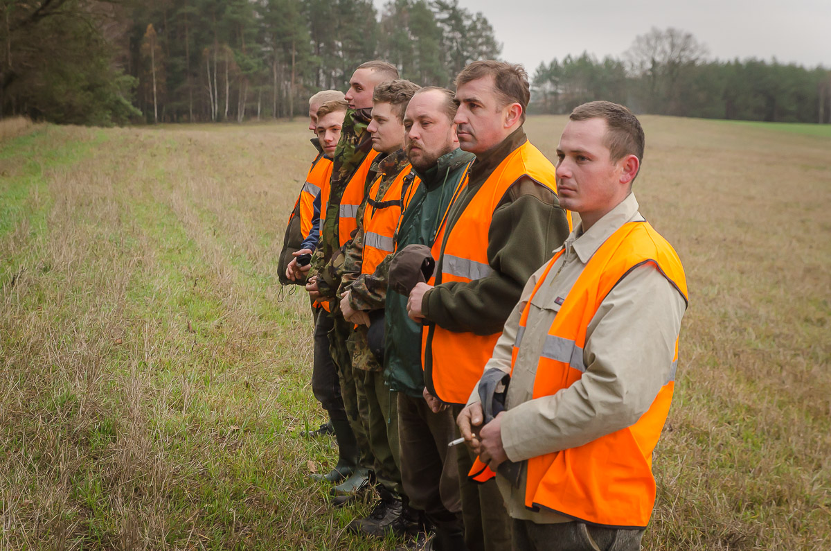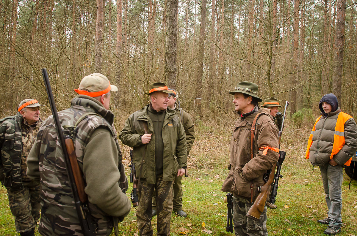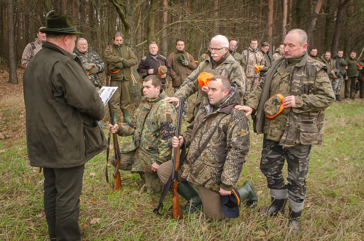 Po mszy świętej przejazd do obwodu i uroczysta zbiórka oraz odprawa myśliwych. W tym roku szczególnie uroczysta ze względu na ślubowanie dwóch nowych, młodych Kolegów, którzy rozpoczynają swoją przygodę z łowiectwem. Odprawę przeprowadził prowadzący dzisiejsze polowanie hubertowskie Prezes Zarządu koła Kol. Waldemar Górski w asyście Łowczego Stanisława Purcel. Prezes Zarządu jako prowadzący dzisiejsze polowanie przeprowadził ślubowanie, które złożyli Koledzy Jan Kalicki i Piotr Olszewski i dla których było to pierwsze polowanie zbiorowe w myśliwskiej przygodzie. Po zakończeniu ślubowania i życzeniach od Kolegów Darz Bór dla młodych myśliwych przyjętych do naszego koła w dalszej części odprawy prowadzący polowanie przypomniał zasady bezpieczeństwa i omówił planowany rejon polowania a także podał planowaną do odstrzału zwierzynę. Na koniec rozlosowane zostały kartki stanowiskowe i po krótkich Darz Bór odprawa została zakończona. Po chwili na uzupełnienie i sprawdzenie ekwipunku niezbędnego na stanowisku, wyruszyliśmy na łowy.