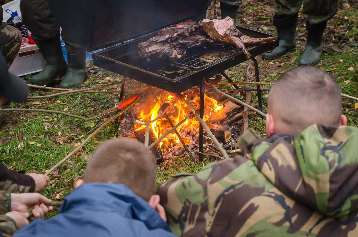 Po zakończeniu polowania przy pokocie na śródleśnej drodze i dokonaniu wszelkich formalności, rozpoczęła się biesiada przy pieczonym dziku, podgrzewanym na ognisku przygotowanym na obrzeżach lasu w specjalnie wykonanym przez członków koła ,,zmyślnym „ piecu oraz pieczonych kiełbaskach.