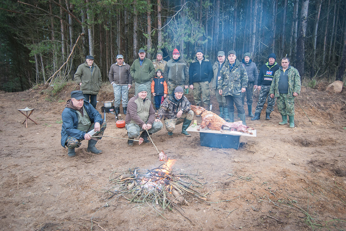 Koniec polowania ogłoszony przez Romana oznaczał rozpoczęcie biesiady. Właściwie, to do faktycznego rozpoczęcia „biesiady” musiało upłynąć trochę czasu ponieważ wszyscy uczestniczyliśmy w łowach i musieliśmy przygotować sobie miejsce spotkania, którym okazała się pewna górka leżąca pod lasem. Jedni zbierali drewno na ognisko a inni odprowadzali ich wzrokiem. Ja strugałem patyki na rozpałkę, robiłem zdjęcia, razem z Romkiem przyniosłem dzika z samochodu, którego potem ćwiartowałem i nakładałem na talerze. W tak zwanym międzyczasie pojawiło się dwóch gości: kolega Stanisław, stary myśliwy, członek naszego koła nie biorący udziału we wcześniejszym polowaniu oraz Bartek, syn Pawła. Bartek ma o ile się nie mylę 7 lat ale mogę założyć się, że o myślistwie wie więcej niż niejeden stażysta pod koniec stażu. Po rozpaleniu ogniska, zebraliśmy się w jego pobliżu by pomodlić się i wysłuchać historii życia Świętego Huberta. Kolega Henio mający najlepszy kontakt z Panem Bogiem i Świętym Hubertem z racji chyba dwumiesięcznego „stażu” w seminarium duchownym podziękował naszemu patronowi za łaski, którymi nas obdarzał na polowaniach i poprosił o nowe, a najlepiej trochę więcej z racji rozwoju koła i wzrostu liczby członków. Po tym nic już nie stało na przeszkodzie aby przystąpić do świętowania. Na pierwszy ogień poszedł Mańkowy bigos podgrzewany podniosłą atmosferą oraz przenośną kuchenką gazową. Bigos wzorem ubiegłego roku był bardzo dobry i wcale nie przeszkadzał w tym brak mięsa 🙂 Żartuję, mięso było ale mocno rozdrobnione. Dzik został upieczony wcześniej i jedliśmy go niestety na zimno. Parę osób wpadło na dobry pomysł i nadziało kawałki dzika na patyki by zagrzać je nad ogniskiem. Wszyscy zgodzili się z wnioskiem, że następnym razem trzeba koniecznie zadbać o rożen byśmy mogli się cieszyć smacznym i gorącym dzikiem. Zaspokoiwszy pierwszy i drugi głód oddaliśmy się rozważaniom na temat „co z tą Polską” przy którym upłynął nam czas do końca spotkania. Chociaż nasze koło jest małe to atmosfera w nim panująca jest pełna koleżeńskości i życzliwości. Oby tak dalej!